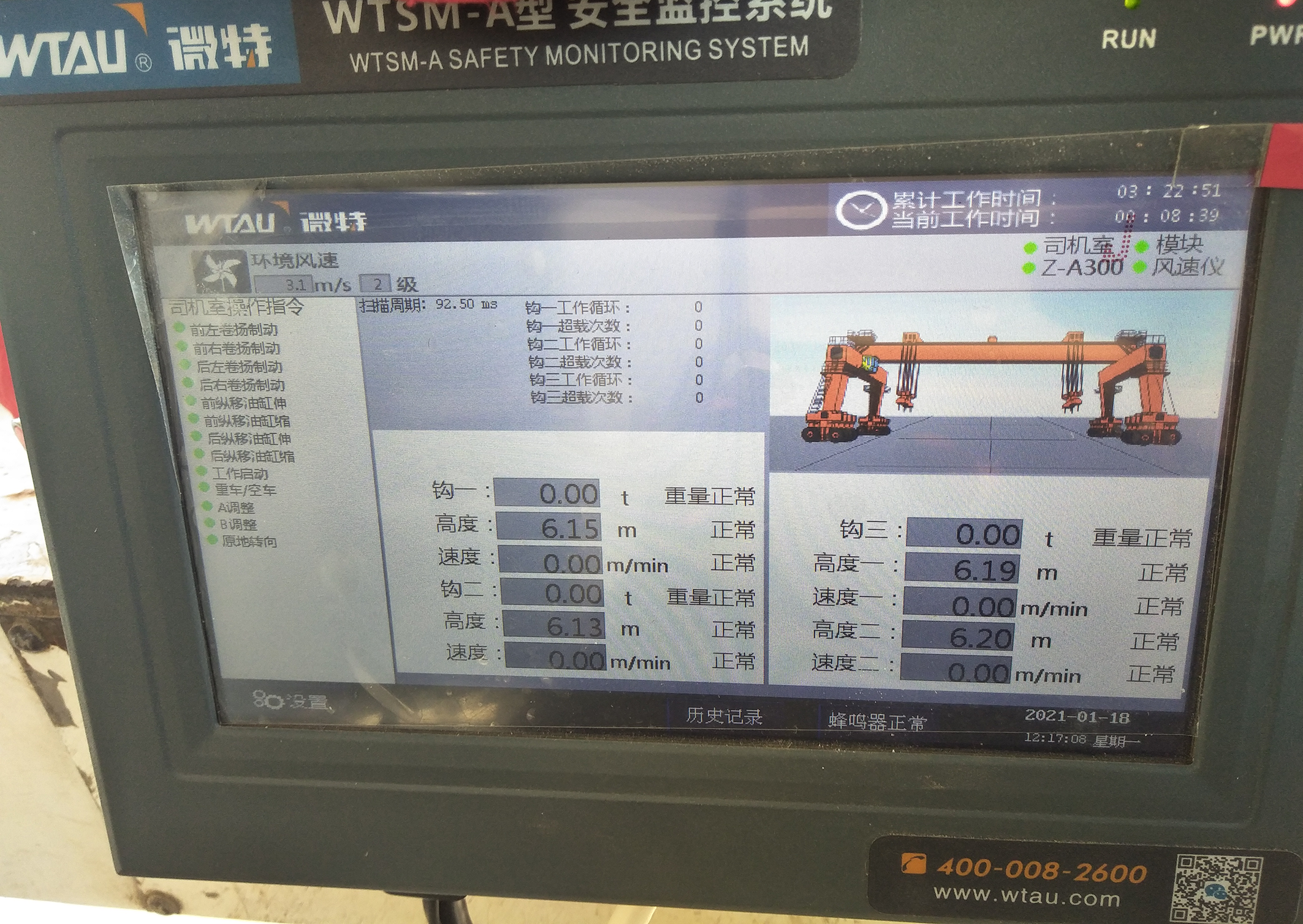 微特研發(fā)的提梁機安全監(jiān)控系統對設備的運行數據進行實時監(jiān)控,該儀表可以顯示提梁機的起升高度、起重量、速度、大車行程、小車行程、同軌道防碰撞、風速、工作次數、超載次數等相關數據實時顯示,并對相關數據進行分析判斷,防止設備向不安全區(qū)域運行。當往不安全區(qū)域運行時,該系統首先會預警,并發(fā)出聲光報警提醒操作人員,并根據實際情況啟動控制功能,使設備相關運行機構停止運行,以起到保護作用。