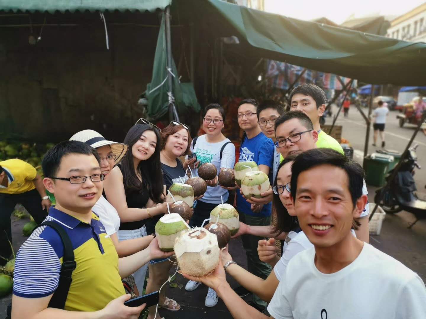抵達酒店后,有些迫不及待了。下午我們一行就轉(zhuǎn)了轉(zhuǎn)周邊的集貿(mào)市場還和水果市場,來到椰城肯定少不了的就是一嘗鮮嫩甘甜可口的椰子了,當然也學到如何選好喝的椰子的方法,青椰、紅椰、金椰,紅椰和青椰個頭差不多大,汁水充足,后者有淡淡的甜味兒,前者則微酸,冰凍過后更加美味。椰肉吃起來也是香香脆脆的,不過只有薄薄一層。挑紅椰的時候不一定非要挑大個兒的,小的有很多皮特薄,椰汁不比大的少。