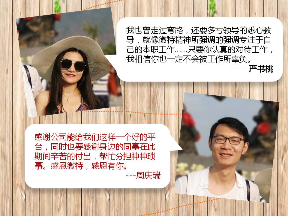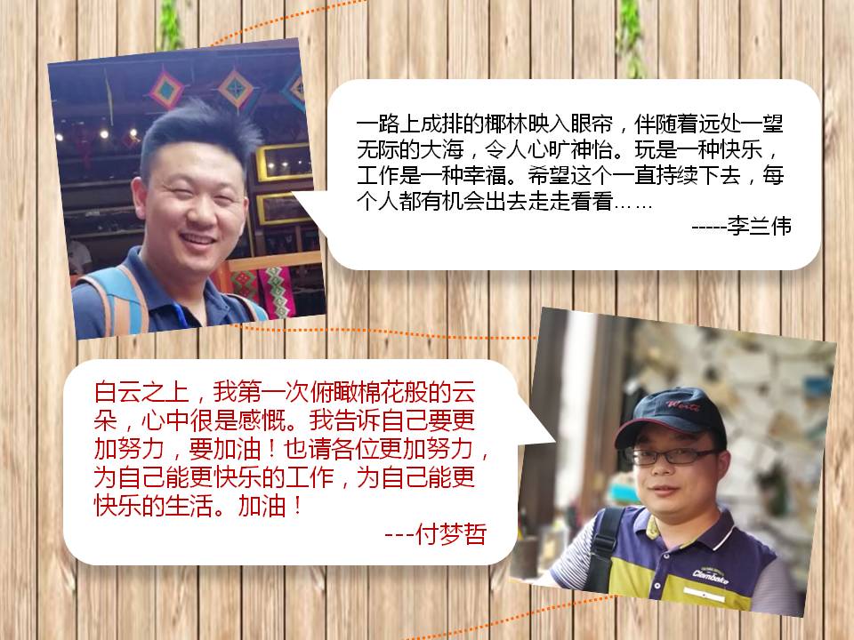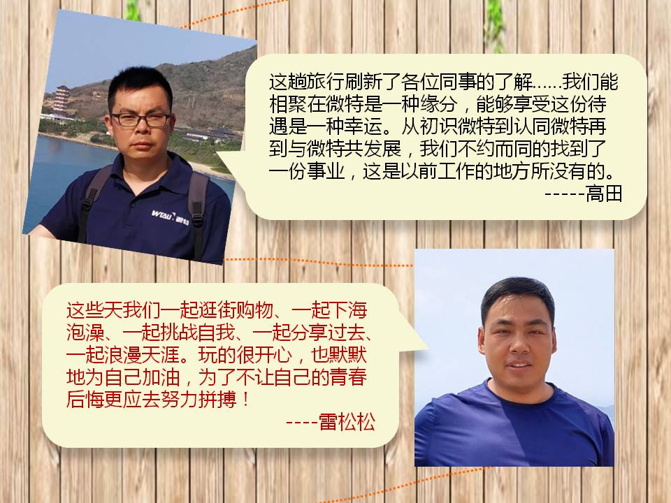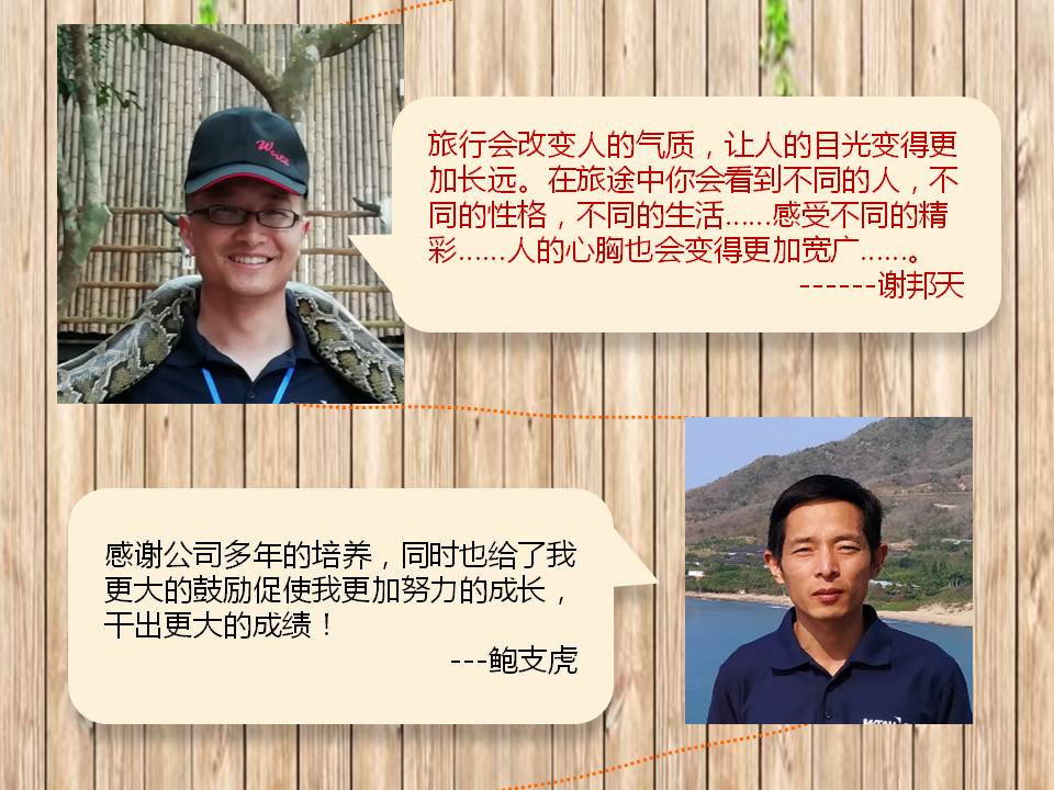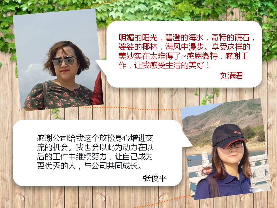 微特為2018年工作表現(xiàn)優(yōu)秀的15名員工給出了特別驚喜的獎勵-雙飛6日海南游獎勵,很有幸也很高興本次被評為優(yōu)秀員工,非常感謝公司領(lǐng)導的多年的培養(yǎng),同時也給了我們更大的鼓勵和激勵,促使我們更加努力更快的成長,干出更大的成就!
