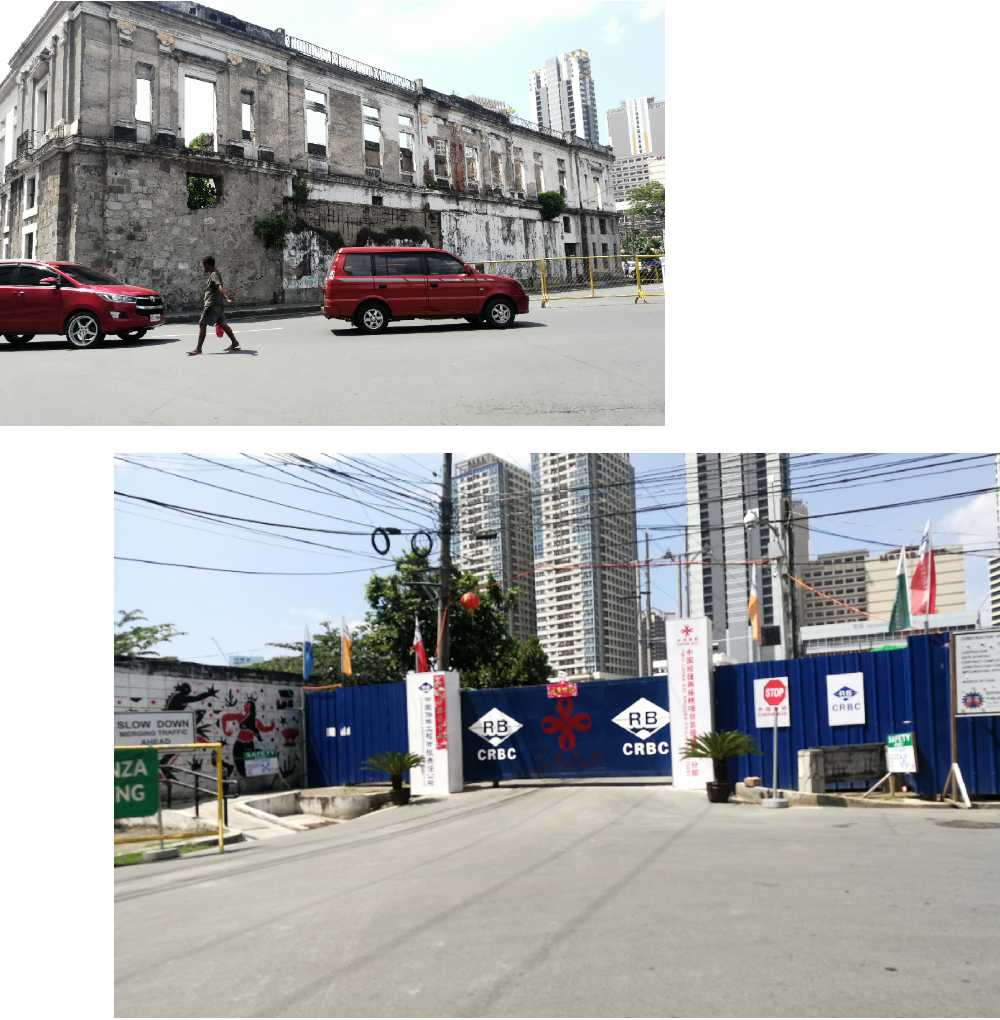 ▲滿目瘡痍的建筑旁邊,有一個掛著“中國援建”的項(xiàng)目正在施工中