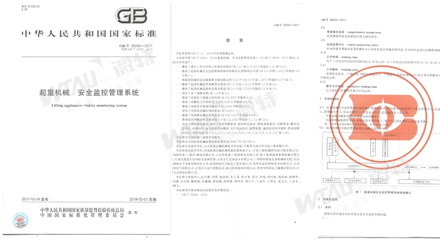 2012年7月中華人民共和國國家質(zhì)量監(jiān)督檢驗檢疫總局、中國國家標(biāo)準(zhǔn)化管理委員會發(fā)布GB/T 28264-2012《起重機械 安全監(jiān)控管理系統(tǒng)》。